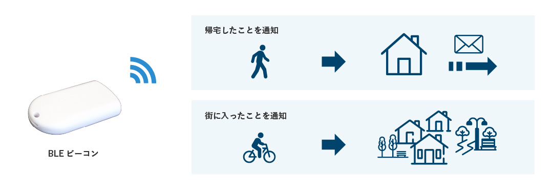 自宅や町内など特定のエリアに近づくと、ビーコン情報を受信したルータからインターネットへ情報を送信します。