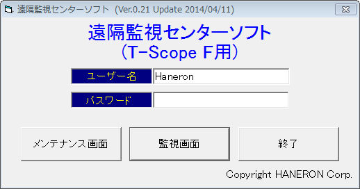 この画面から、監視センターソフトの設定を変更するメンテナンス画面や端末装置の監視画面を呼び出すことができます。